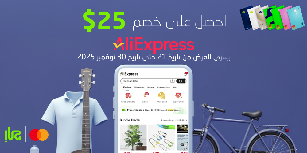 المنامة، البحرين: أعلن بنك "إلى" الرقمي الرائد في البحرين، والمتوفّر حصريًا عبر الهواتف الذكيّة، عن شراكته مع عملاق التجارة الإلكترونية العالمية "علي إكسبرس" لتقديم خصم فوري بقيمة 25 دولار أمريكي على المشتريات التي تبلغ قيمتها 50 دولار أمريكي أو أكثر. يؤكد هذا العرض حرص بنك "إلى" على تحسين أنماط حياة العملاء وتقديم عروض قيِّمة تعزز من رفاهيتهم المالية.